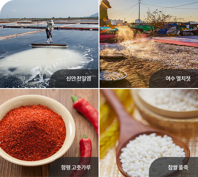 전남의 청정지역에서 생산된 배추, 무, 마늘 등 채소와 천일염, 멸치젓 등 다양한 재료를 사용하여 김치의 재료가 신천하고 풍부하다.