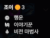조이는 '행운', '이야기꾼', '비전 마법사' 총 3가지의 시너지를 가지고 있습니다.