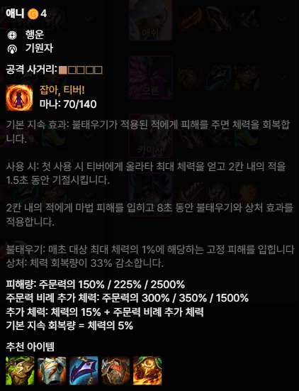 마지막으로 행운 시너지의 탱킹을 담당하는 4 코스트 챔피언인 애니를 분석해 보겠습니다.