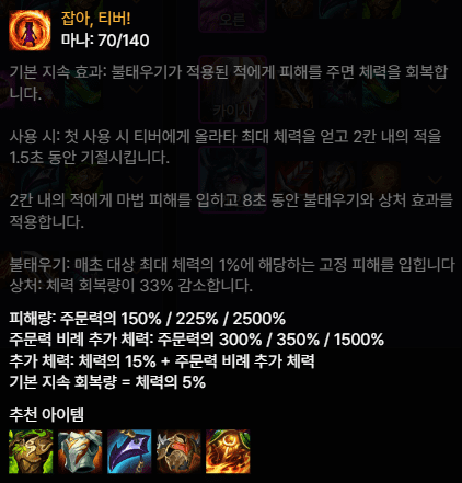 - 사용 시: 첫 사용 시 티버에게 올라타 최대 체력(체력의 15% + 주문력의 300% / 350% / 1500%))을 얻고 2칸 내의 적을 1.5초 동안 기절시킵니다. 2칸 내의 적에게 마법 피해(피해량: 주문력의 150% / 225% / 2500%)를 입히고, 8초 동안 불태우기와 상처 효과를 적용합니다.