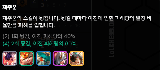 재주꾼 시너지 효과로는 재주꾼의 스킬이 튕기며, 튕길 때마다 이전에 입힌 피해량의 일정 비율만큼 피해를 입힙니다.