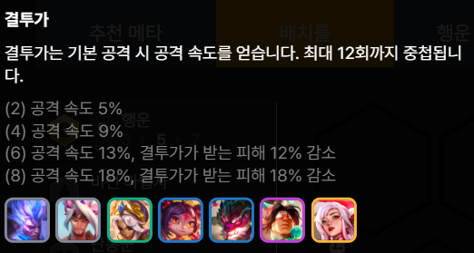결투가 시너지 효과로는 결투가는 기본 공격 시 공격 속도를 얻으며, 최대 12회까지 중첩됩니다.