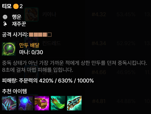 티모 '행운' 시너지를 스타트하기 위해서는 빠르게 나와주어야 하는 챔피언 중 하나입니다.