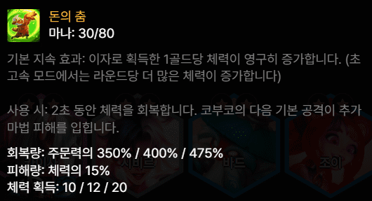 그래서 코부코가 시작 라운드에서 나올 경우 안정적으로 체력을 조금씩 늘릴 수 있고, 3 행운 시너지를 빨리 맞출 수 있어 중요한 스타트포인트라고 생각됩니다.