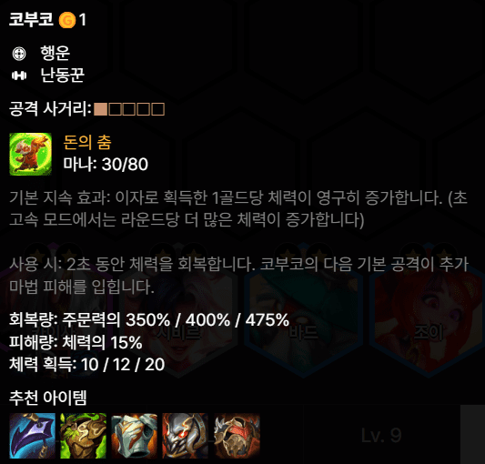 코부코는 1 코스트 챔피언으로 '행운' 시너지를 가기 위해서는 코부코가 1라운드에서 나와주는지 혹은 나와주지 않는지가 중요한 스타트포인트가 됩니다.