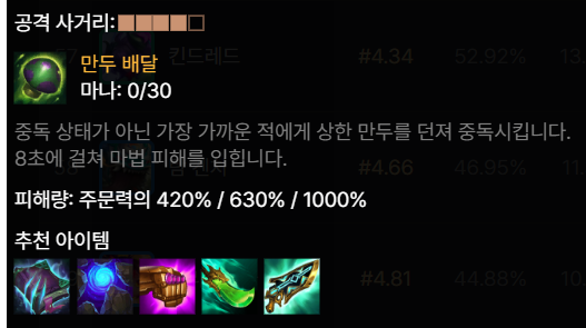 티모의 스킬은 중독 상태가 아닌 가까운 적에게 상한 만두를 던져 중독시켜, 8초에 걸쳐 마법 피해를 입힙니다.