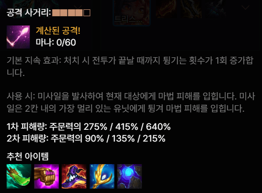 - 기본 지속 효과: 처치 시 전투가 끝날 때까지 튕기는 횟수가 1회 증가합니다.