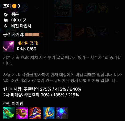 행운 시너지의 3 코스트 챔피언인 조이에 대해서 알아보겠습니다.