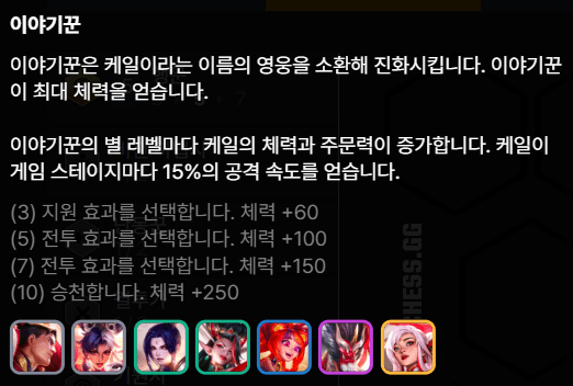 이야기꾼 시너지는 케일 챔피언을 소환하고, 시너지가 활성화될 때마다 케일의 선택을 선택하여 케일을 강화시키는 시너지입니다.