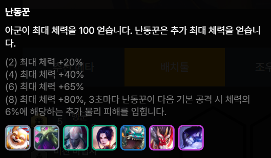 난동꾼 시너지의 효과로는 아군이 최대 체력 100을 얻고, 난동꾼은 추가 최대 체력을 얻습니다.