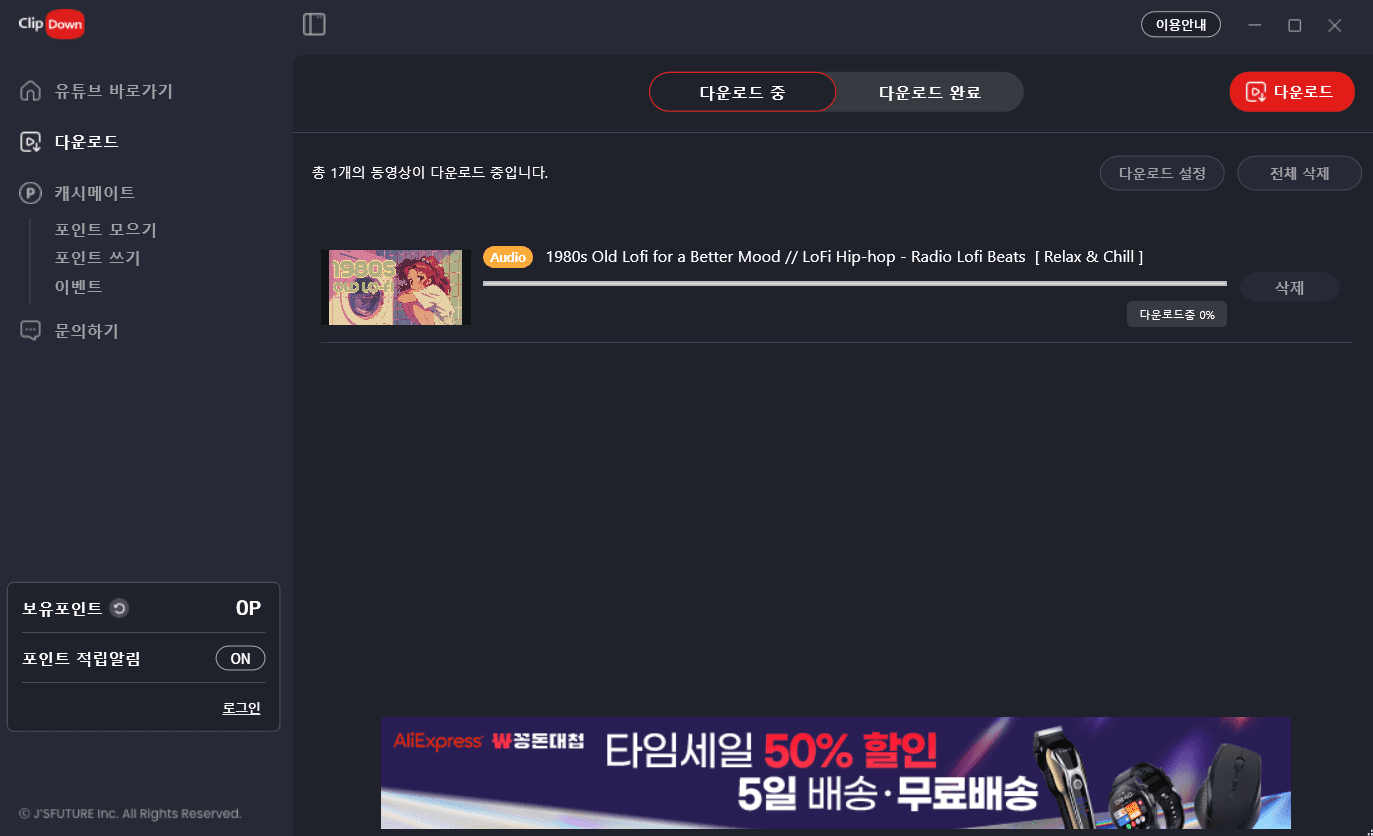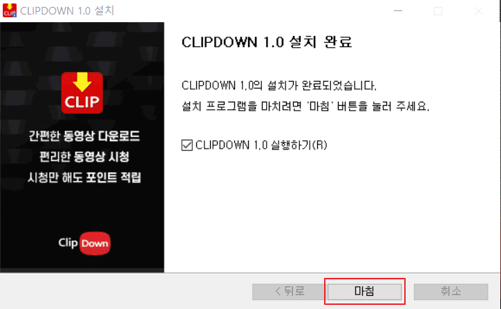 '마침'버튼을 클릭하면 클립다운 프로그램을 이용할 수 있습니다.