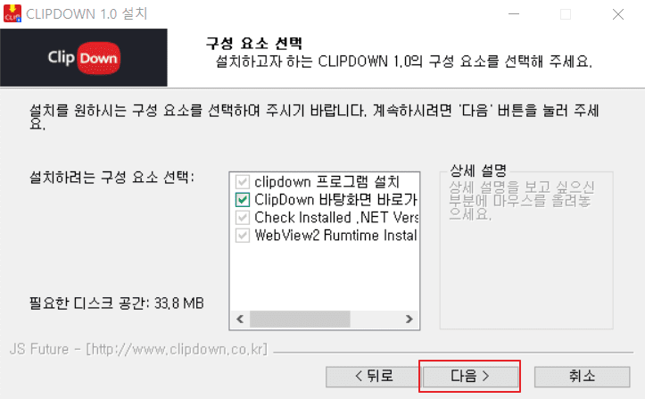 설치 구성 요소는 클립다운 프로그램의 요소를 선택할 수 있습니다.