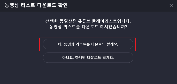 '네, 동영상 리스트를 다운로드할게요.' 버튼을 클릭하면 저장 리스트에 담겨있는 모든 음악파일을 다운받으실 수 있습니다.