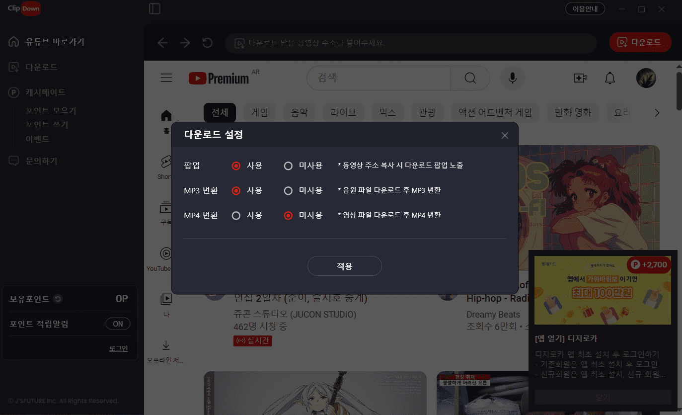 팝업: 유튜브 동영상 주소를 복사하면 동영상 다운로드 팝업제공을 설정하는 옵션입니다.