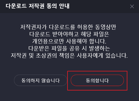 클립다운 영상 다운로드에 앞서 다운로드 저작권 동의 안내 팝업이 제공됩니다.