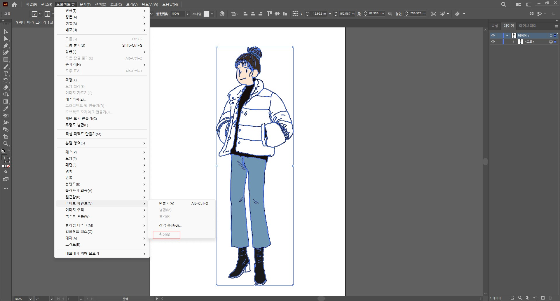 현재는 라인 작업을 한 결과가 라인으로 되어 있는 것을 확인할 수 있을 텐데요, 그 결과를 그림처럼 만들기 위해서는 '확장' 작업이 필요합니다.