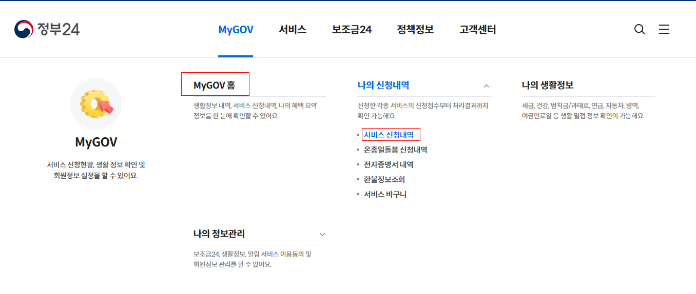 발급 시 자동으로 이동하지만, 직접 찾아가기 위해서는 "MyGOV" 탭에서 확인할 수 있습니다.