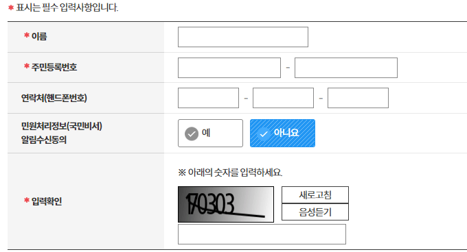 모든 개인정보 수집 및 고유식별정보 수집 이용동의 후 신청 정보를 입력합니다.