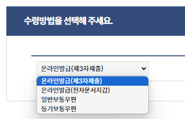 ※온라인 발급을 위해서는 수령방법 선택 시 "온라인발급(제삼자제출)"으로 선택하셔야 합니다.