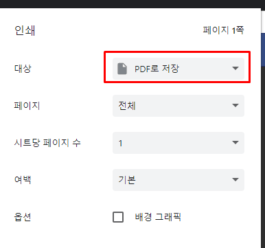 대상을 "PDF로 저장"으로 선택 후 "저장" 버튼 클릭 시 PDF로 저장이 가능합니다.