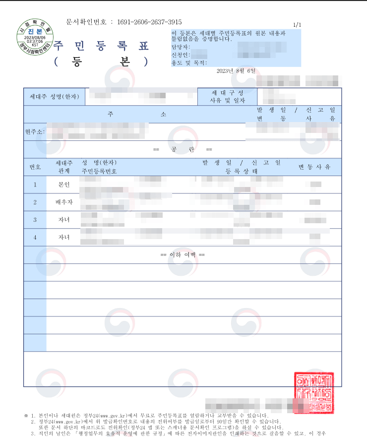 주민등록 등본은 현재 본인의 주민등록상의 주소지 및 거주하고 있는 본인과 세대구성원 정보가 들어 있습니다.
