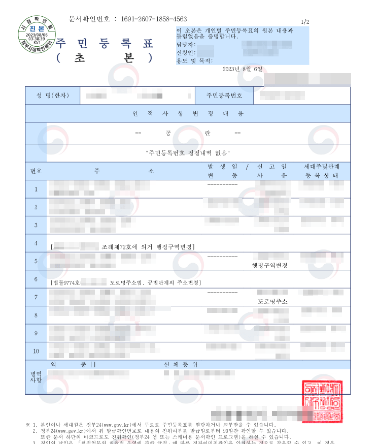 주민등록 초본의 경우 본인이 살아오면서 거쳐간 모든 과정(예: 과거 거주 정보)이 들어 있습니다.