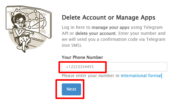 'Yes, delete my account' 버튼을 클릭하면 텔레그램 계정을 삭제할 수 있습니다.