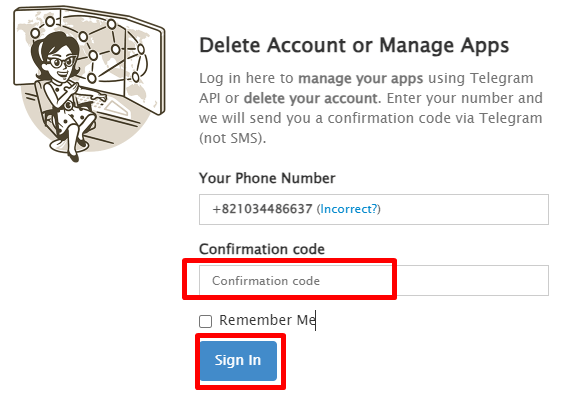 텔레그램 메시지를 확인하여 '탈퇴 코드'를 입력한뒤 'Sign in'버튼을 클릭합니다.