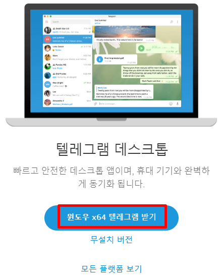 '윈도우 x64 텔레그램 받기' 버튼을 클릭하여 텔레그램을 설치합니다.