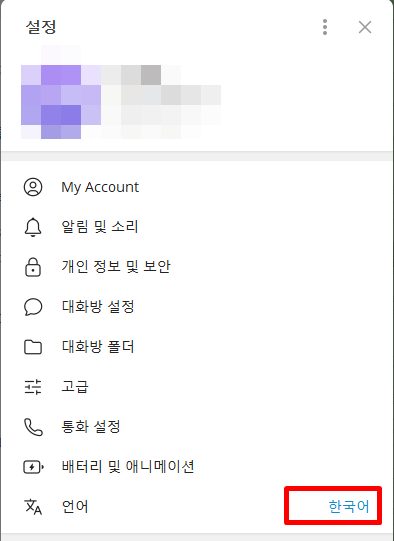 3. '언어' 설정 버튼을 클릭하여 언어를 '한국어'로 변경합니다.