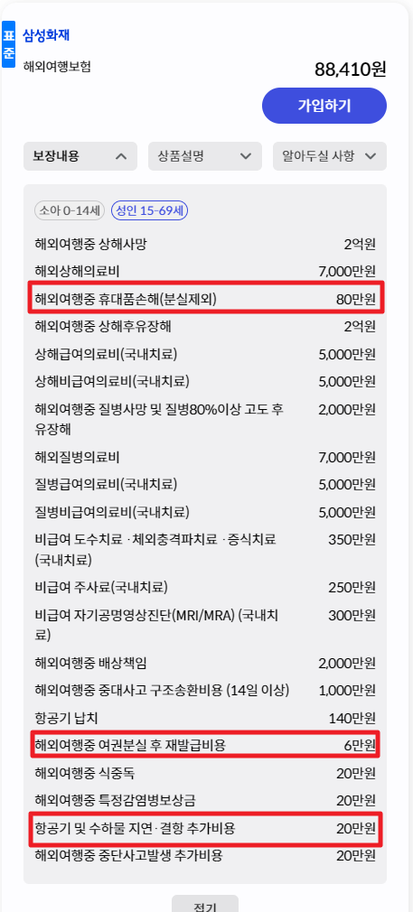 삼성화재의 여행자 보험의 경우 휴대물품 보장은 80만 원으로 가장 낮았고, 메리츠화재와 동일하게 여권 분실 보장 6만 원, 항공기 및 수하물 지연 비용 보장 20만 원이었으며, 다른 여행자 보험보다 의료 진료 보장에 힘을 주는 보험이었습니다.
