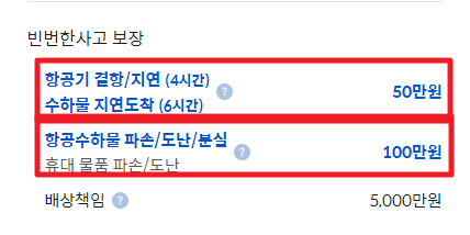 상성화재(항공기 결항/지연 20만 원, 휴대 물품 80만 원) < 메리츠화재 = 하나손해보험(항공기 결항/지연 20만 원, 휴대 물품 100만 원) < 마이뱅크(항공기 결항/지연 50만 원, 휴대 물품 100만 원)