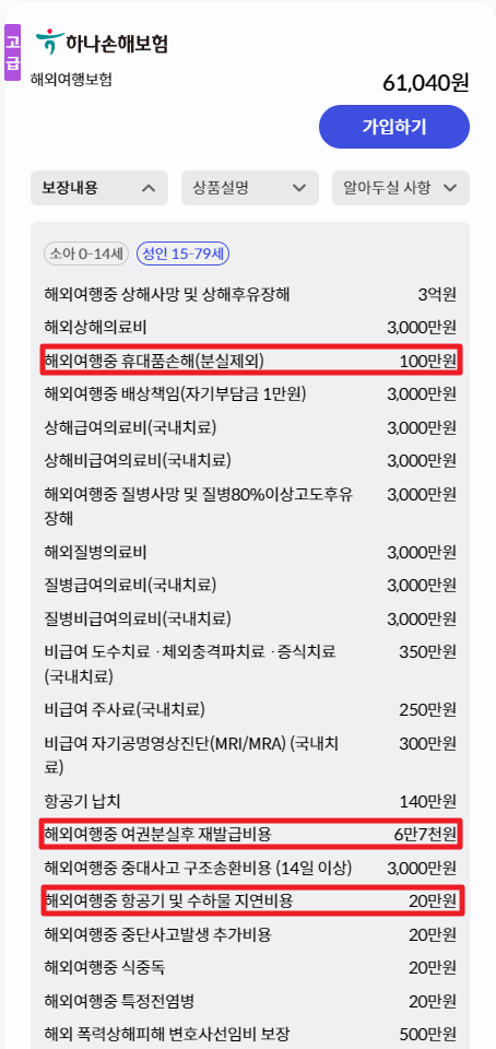 하나손해보험의 여행자 보험의 경우 여권 분실 보장 6만 원 7천 원으로 7천 원 더욱 높았고, 휴대물품 보장은 100만 원, 항공기 및 수하물 지연 비용 보장 20만 원으로 메리츠화재와 동일했습니다.