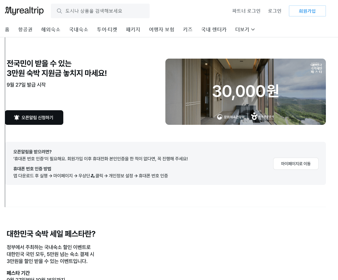 국내 숙박상품 5만 원 초과 시 3만 원 할인해 줍니다! 선착순 30만 명에게만 할인권이 지급되니 빠르게 발급받길 바라겠습니다.