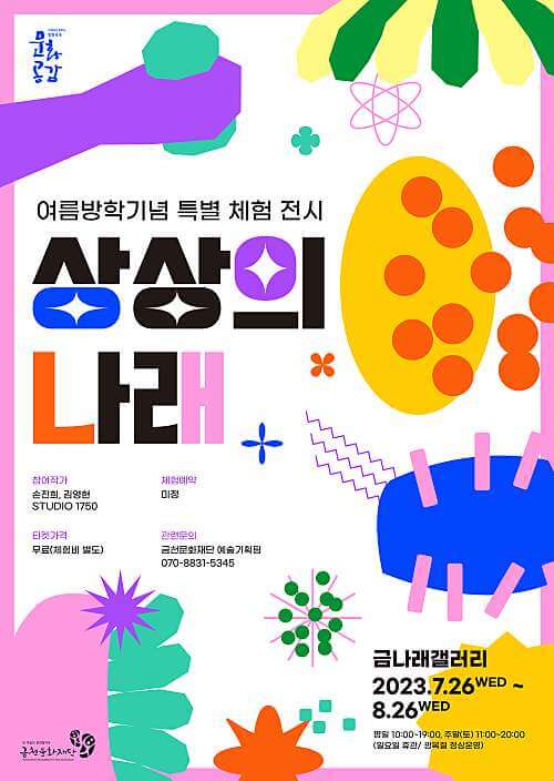 상상의 나래 전시는 '상상'과 '경험', '모험' 그리고 '금천'을 주제로 기획된 전시로, 다양한 오브제들이 전시장을 포함한 아트홀 로비, 천창, 야외 공간을 가득 채우고 있습니다. 이로 인해 금나래아트홀은 공연, 전시, 체험, 교육의 놀이터가 되어 관람객들에게 '상상의 나래'를 펼칠 수 있는 기회를 제공합니다.